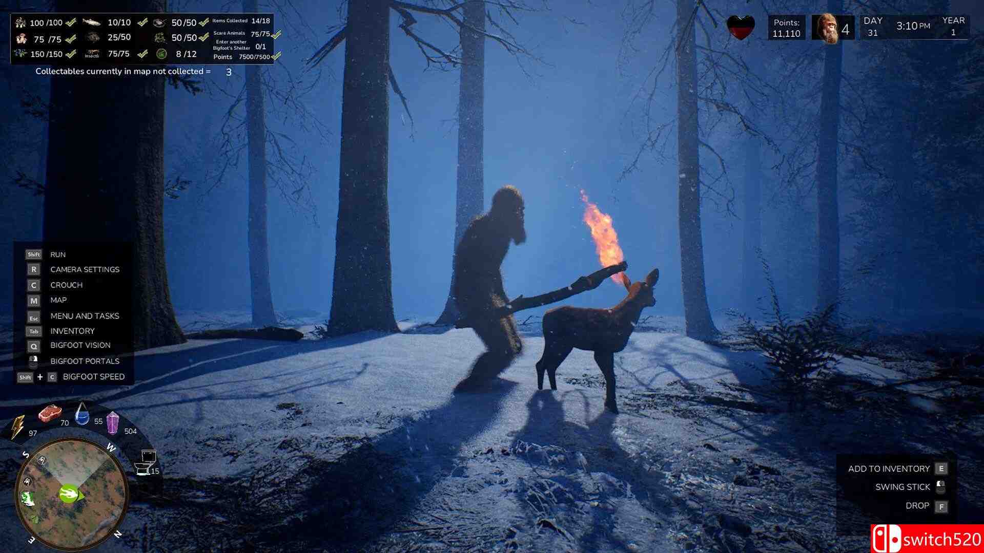 《大脚怪生活》是一款模拟经营类(SIM)游戏,这是一款模拟游戏,让你体验大脚怪的生活。捕鱼、采摘蘑菇和浆果、搭建庇护所等等。成为传奇,体验精彩的大脚怪生活switch520